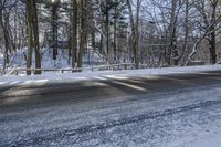 A scenic landscape in Ontario, Canada. The asphalt road winds through the dense forest, surrounded by snow-covered trees. The clear sky with fluffy clouds adds to the natural beauty of the rural area.