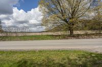 the stop sign is displayed on the side of the road by the grassy field with a lone tree