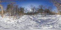 A panoramic view of a snow-covered road in rural Ontario, with snow-covered trees on both sides. The clear blue sky and bright sunshine cast hard shadows on the road. A perfect winter day in Canada.