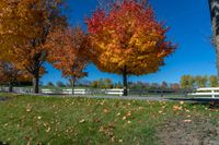 This image captures a rural road in Ontario, Canada. The road is lined with vibrant trees, their orange leaves providing a colorful contrast against the clear sky. In the background, a white fence stands tall, adding to the charm of the agricultural landscape. This photo represents a peaceful day in the Canadian countryside, showcasing the beauty of nature and the tranquility of the scene. The green fields surrounding the road highlight the importance of agriculture in the region. Experience the serenity of rural Ontario with this captivating image.