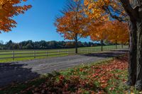 A road in rural Ontario lined with yellow trees in the fall. The field behind is filled with greenery. Clear skies cast hard shadows on the asphalt, creating a picturesque scene.