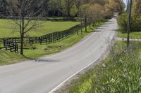 A lush green landscape of rural Ontario, with a tree-lined road leading to a farm. The asphalt driveway is bordered by a grassy path and guarded by Armco barriers. A serene view of Canada's countryside.