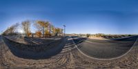 a 360 - view camera is positioned in the foreground to the image and shows two tracks of dirt and trees