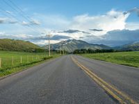 A scenic rural road in Colorado, surrounded by lush greenery and farmlands. The break of day illuminates the landscape of Aspen trees and mountainous terrain. Clouds enhance the picturesque dawn over the American countryside.