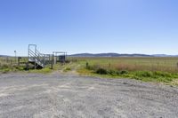 a fenced area with a gate on the edge and mountains in the distance on a clear day