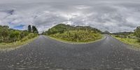 A gloomy day on a rural road surrounded by grassy hills and trees. The wide open road curves through the landscape, leading to a grey sky. A serene and peaceful scene in the highlands.