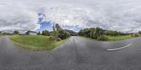 A wide-angle view of a two-way road surrounded by lush green vegetation. The road curves in an S-shape, leading up to a highland mountain landscape. The overhead fisheye lens image captures the natural beauty of this rural wilderness.
