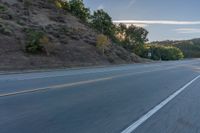 A rural road winds through a hilly terrain at dawn. The asphalt surface glows in the early light, surrounded by lush vegetation. Clouds add drama to the picturesque scene.