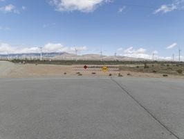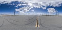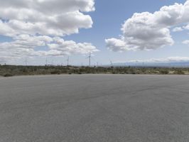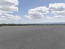 An open space, a plain field, and a rural road surface in the midst of a vast landscape. White clouds dot the blue sky, creating a picturesque horizon. A peaceful scene captured on a sunny day.