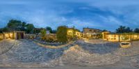 Rural road in Majorca, Balearic Islands, Spain. Artificial light casts hard shadows on pavers, illuminating farmhouses. Night-time scene with dark clouds over Europe's open spaces.