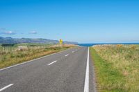 empty road with signs on the sides of both sides and a blue ocean in the back ground