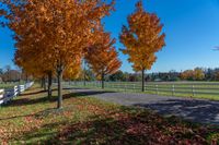 A beautiful rural road in Ontario, Canada, lined with vibrant trees displaying colorful leaves. The white fence along the road is adorned with a bench, inviting passersby to enjoy the picturesque scenery.
