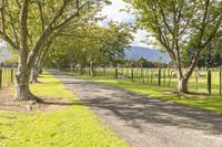 the road is surrounded by trees along the grassy side of the farm, which has a fence