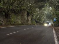 A serene rural road in Tenerife, Spain, surrounded by misty forests and a gloomy grey sky. The wet asphalt and light streaks from passing vehicles create a hauntingly beautiful scene.
