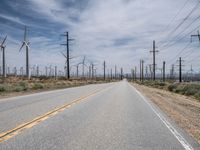 Asphalt roads stretch across Mojave Desert under clear California skies. Windmills dot the landscape, capturing Los Angeles' renewable energy ambitions. A rural day scene representing the interplay of nature and infrastructure in the USA.