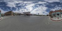 a 360 - panoramic view of an empty street with buildings and shops across the street