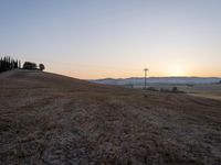 A serene dawn landscape in rural Tuscany, Italy. Gravel road winds through open spaces and rugged terrain, surrounded by gardens and cypress trees. Clear sky adds to the beauty of the European countryside.