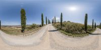 a series of 360 degrees view of a road, with trees and bushes lined in rows