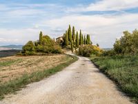 A picturesque dirt road in rural Tuscany, Italy. The rugged landscape is framed by rows of cypress trees. Clear skies and gravel paths guide the way through this charming European countryside.