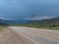 A gloomy day in rural Utah. The asphalt road winds through the landscape, surrounded by majestic mountains. The grey sky adds a touch of drama to the scene, enhancing the natural beauty of the area.