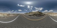 an empty road with some rocks and a sun in the sky, surrounded by a rocky cliff, and in the middle of a desert landscape