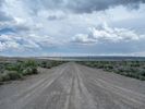 A gloomy day in rural Utah. A straight road stretches through the open space, surrounded by gravel and sand streets. The grey sky adds to the gloominess of the landscape.