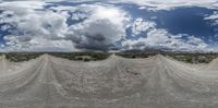 a view from below a road in a desert field with clouds overhead and dirt terrain