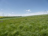 This image showcases a picturesque rural landscape in Germany. A lush, green grass field extends towards a windmill farm in the distance. The clear sky above provides a serene backdrop for the wind turbines. The photo captures the beauty of nature and the integration of renewable energy in a European countryside village. As you walk along the path, you can appreciate the harmonious coexistence of agriculture and sustainable infrastructure. This scene represents an idyllic day in the German countryside.