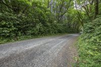 A lush green landscape with trees and vegetation covering the forest floor. A dirt road cuts through the dense forest, providing a natural and rustic pathway. The vibrant colors of nature create a picturesque scene.