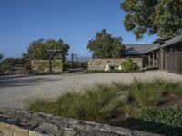 This captivating stock photo showcases a charming rustic home nestled in a peaceful country setting. The property is located in the beautiful city of Los Angeles, California, USA. The image features a gravel driveway leading up to the house, surrounded by lush green grass, trees, and shrubs. A stone pathway and stone walls add to the picturesque landscape. The clear sky and open space create a serene atmosphere. This image is perfect for any real estate or architecture project.