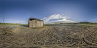 an outhouse stands in a muddy field, with a sky background behind it on a partly cloudy day
