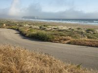 This image captures the picturesque coastal landscape of California, USA. The road, covered in asphalt, winds its way along the high elevated shore, surrounded by vegetation, grass, and sand. The curve of the road creates an S-curve as it overlooks the deep blue ocean and crashing waves. In the distance, the clear sky contrasts with the gloomy grey sky, creating a moody atmosphere. The tranquil scene is completed with the presence of fog and contrails in the sky. This photograph represents a peaceful day along the California coast.