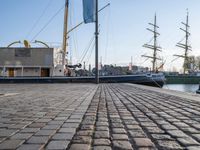 A sailboat docked at the harbor of Bremerhaven, Germany. Clear skies and city life in the background create an urban oasis. Cobblestone surfaces and urban design complement the open space of the pier.