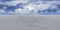 Expansive salt flats stretch under a sunny skydome. The sun's light creates an endless open space, contrasting with clouds. A picturesque salt lake landscape.