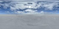 The endless salt flat stretches under a bright skydome. A cloud-dappled sky highlights open spaces of the sunlit desert landscape. Salt lake reflections add to the picturesque environment, with sunshine bathing the terrain.