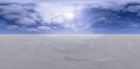 Endless salt flat under sunny skies with the sun visible. Clouds add depth to the expansive desert landscape. An inspiring daytime view of open space.