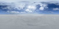 Vast salt flat landscape stretches under a sunny sky with clouds. Expansive open space offers stunning views of the salt lake. The sun's rays illuminate the endless desert scenery, creating captivating environmental vistas.