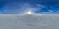 Endless salt flats under clear sunny sky, creating a vast, open-space desert environment. Skydome of clouds enhances the expansive landscape, where the sun is prominently visible. A quintessential sunny day at a salt lake.