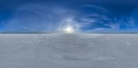 Salt flats stretch across an open space under a cloud-dotted skydome. Sunlight illuminates the landscape, highlighting an endless salt lake. A typical sunny day in a desert filled with salt and sunlight.
