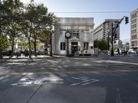 a building with a clock sitting on the corner of a city street with some vehicles and people