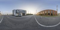 street in the city with a delivery truck and buildings as the image is 360 - fisheye