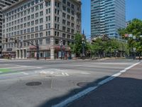 A modern architecture office building in Salt Lake City, Utah. The hard shadows cast by the clear sky create a striking urban design. The road and asphalt add to the city's bustling atmosphere.
