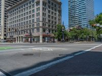 an intersection with buildings on both sides and a street light in the middle of the road