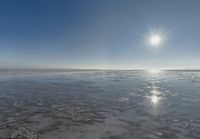 A packshot of the Salt Lake City landscape under a clear sky on a sunny day. The salt lake reflects the open space and mountains of Utah. Nature's beauty in the desert with the sun visible.