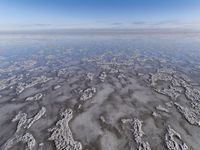view from the airplane's side shows the water and sand that looks like water in the sky