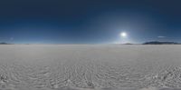 An open desert landscape in Salt Lake City, Utah, at dawn. Clear sky with the sun visible, casting a warm glow over the salt surface. Nature's beauty at the break of day in the USA.