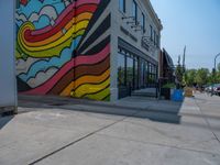 A vibrant graffiti wall in Salt Lake City's art district. The concrete street is lined with storefronts and shops. Hard shadows add depth to the colorful street art. Clear sky overhead creates an inviting atmosphere.