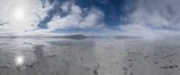 Vast open space in Utah's Salt Lake City, with sun visible over mountainous desert landscape. Brilliant sunshine illuminates the salt-covered terrain. Clouds dot the sky on a sunny day in the USA.