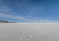 This image showcases the stunning landscape of Salt Lake, Utah in the USA. The photo captures the open space of the desert, with mountains in the background. The clear day allows for the visibility of contrails in the sky. The natural beauty of the salt lake and surrounding nature is on full display. This photo is a packshot of the breathtaking landscape of Salt Lake, capturing the essence of the desert and mountains in Utah.