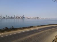 This image captures the city life of San Francisco, California, with its modern architecture and iconic skyline. The photo is taken during the day, with a clear sky and a view of the ocean from a highway. The city's metropolitan area is showcased, with high-rise condominium buildings and skyscrapers lining the coast. In the foreground, the road surface and guard rail can be seen, leading towards the horizon. The image provides an overlook of the cityscape and urban design, highlighting the bustling metropolis and its scenic location by the water.